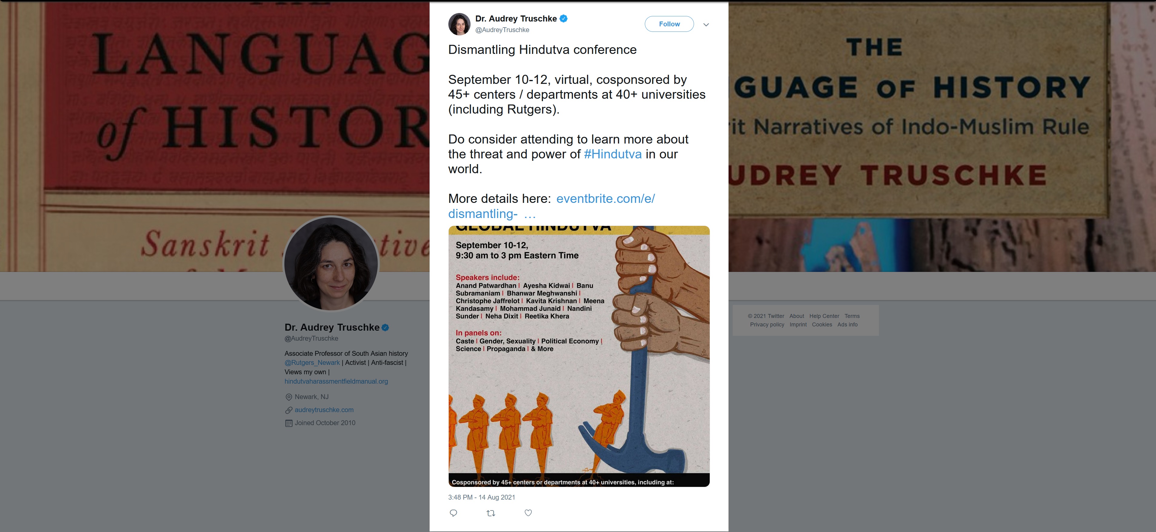 Image of Audrey's tweet supporting Dismantling Global Hinduva Conference and Rutgers official sponsorship of it