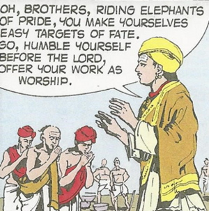 Once, when accused in the king’s court of eating at the home of an ‘untouchable’ śaraṇa (devotee of Śiva), Basava declared, “The same blood flows through the body of an untouchable as through a brāhmaṇa. This śaraṇa is a great bhakta of Śiva and therefore superior to so-called brāhmaṇas without devotion.” When mocked about whether milk flowed in the veins of the untouchable, Basava cut the tip of the śaraṇa’s finger, and to everyone’s astonishment, milk, not blood, flowed out. This miracle silenced his critics.