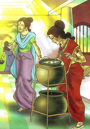 On the wedding day, Līlāvatī anxiously waited beside the device while her father greeted the groom and guests. When the priests began chanting the mantras, everyone awaited the precise moment indicated by the water level. However, the water seemed unusually slow to drain. When Bhāskara examined the pot, he discovered that a pearl from Līlāvatī’s necklace had accidentally fallen into the vessel and partially blocked the hole. Because of this obstruction, the auspicious time passed before the required water level was reached.