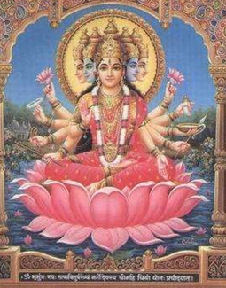 Both male and female deities are praised in the veda-s. Female deities such as Uṣas and Sarasvatī are invoked with epithets of brilliance, wisdom, and auspiciousness. The Atharvaveda begins with an invocation to a devī dwelling in waters who fulfills human desires.[3] The Gāyatrī Mantra, regarded as the holiest prayer, is symbolically represented as a five-headed goddess and called the “Mother of the Vedas.”[4]